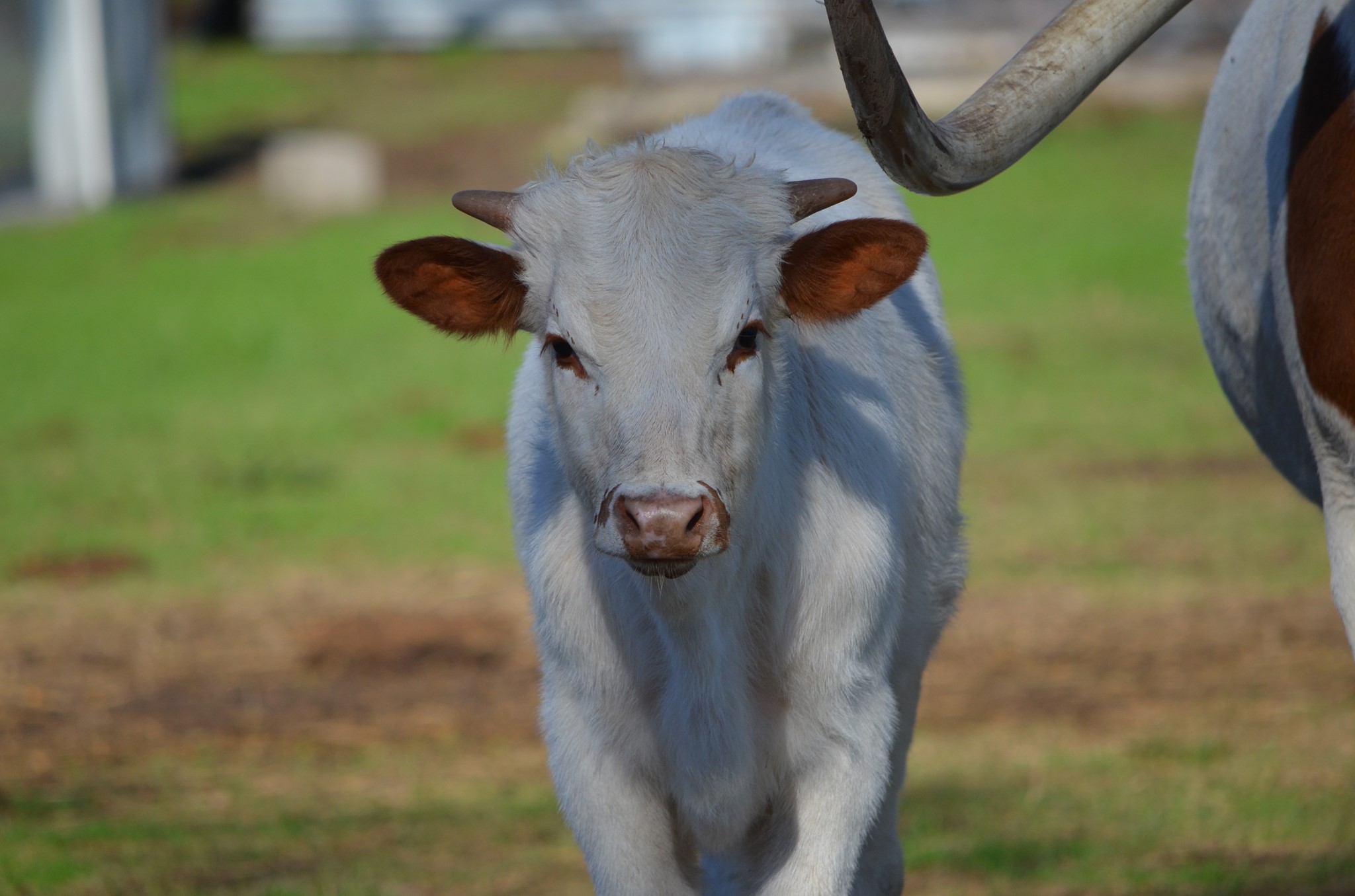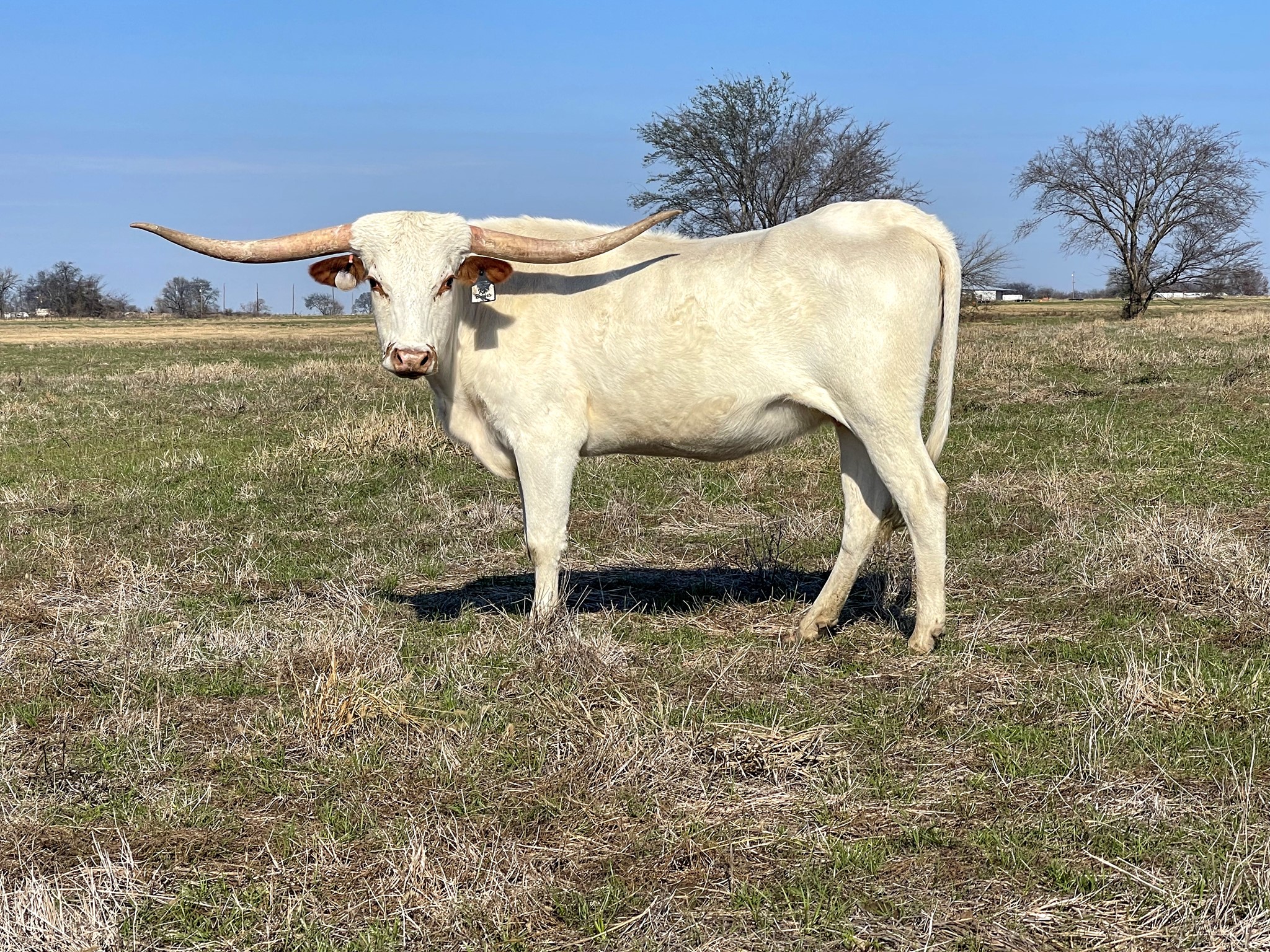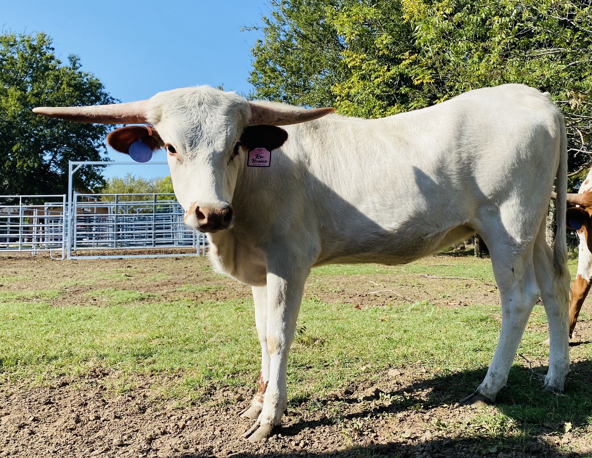 There is not enough good things to say about this heifer here. She looks like a plain white heifer but actually she carries the double wild gene, meaning she can not throw a red calf. She she has the color thing down and paired with the right bull it should be magic. She also is a 7 on the tenderness scale and a great milker for a first time heifer. She is easy going and I love the direction of her horns, she has a low nice twist started. We paired her with Zane for her first calf which we got a great heifer, but will be AI her this next round. We are very excited to have this heifer to work with in our herd for the future.