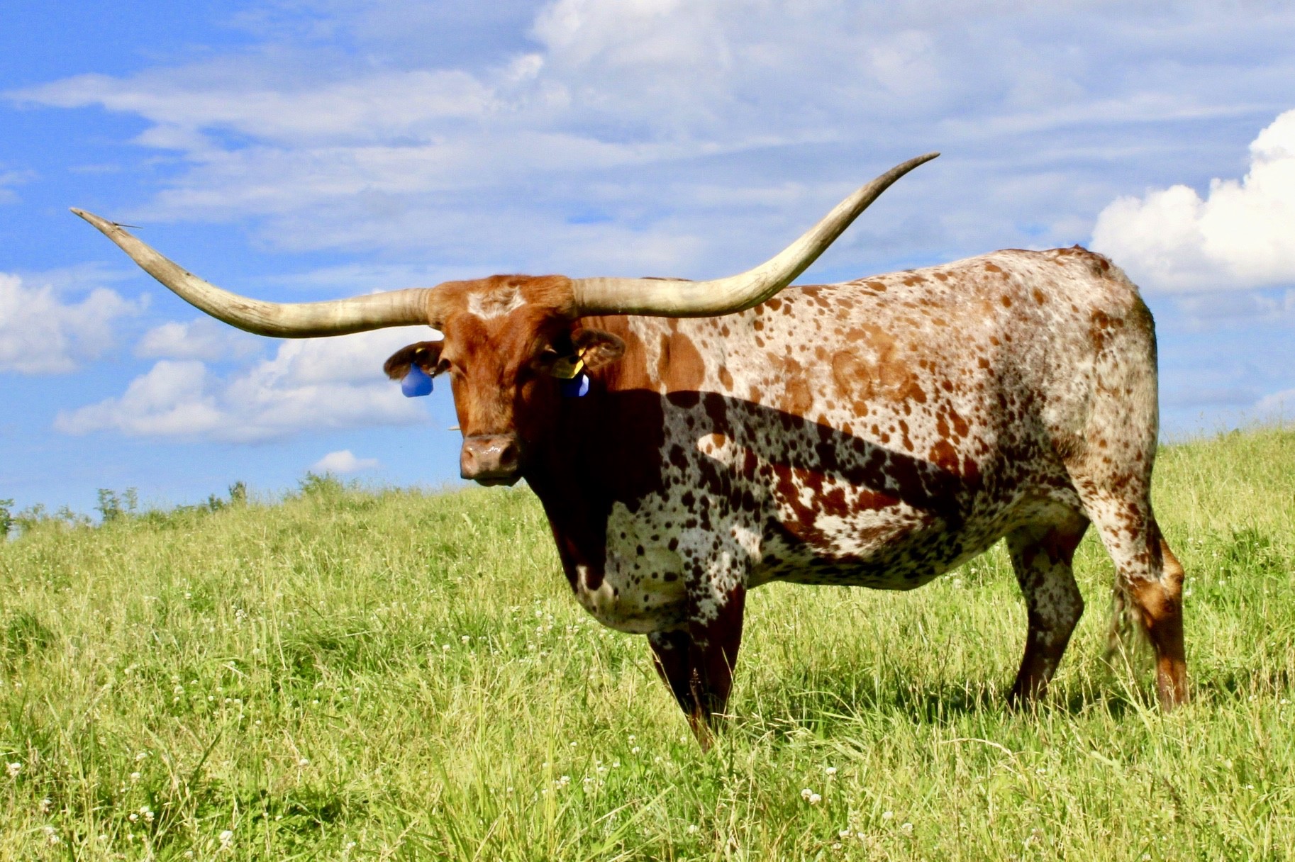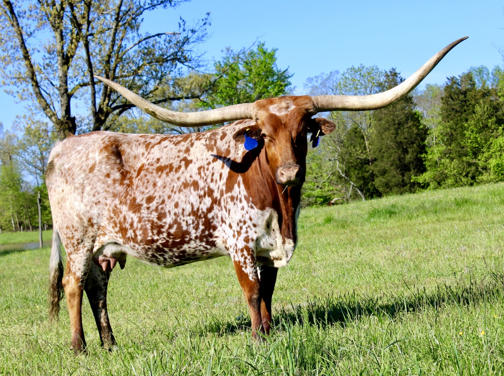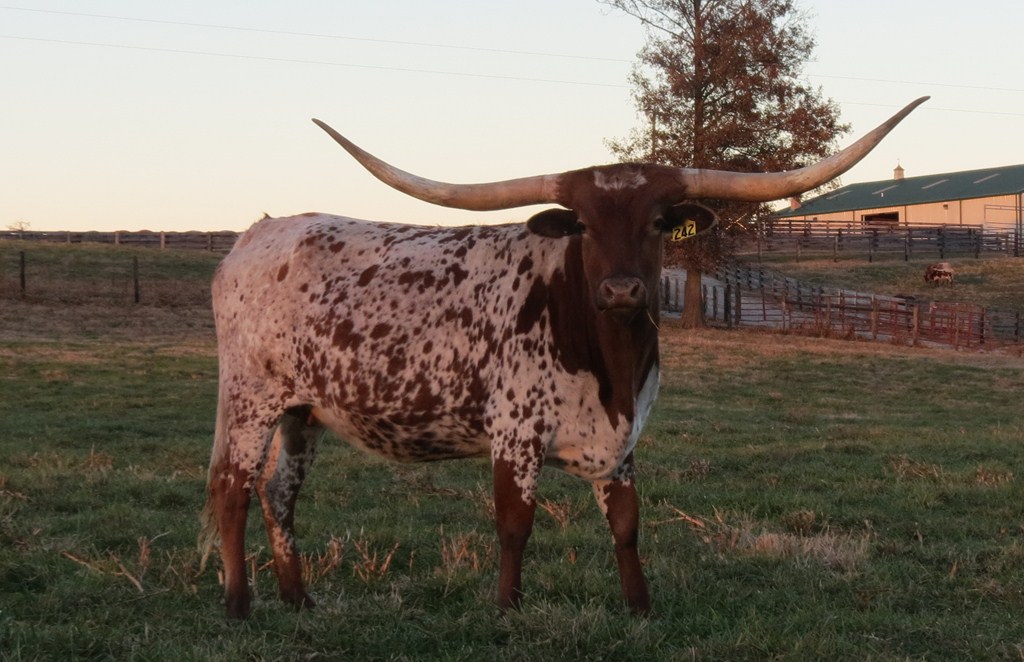 One of our best foundation cows with almost 84"TTT, daughter of Hot Playboy who goes to J.R Grand Slam, and Boomerang CP. This cow has a deep body with perfect conformation, great color, beautiful horn set, and great disposition. She has proven herself as a great producer of fine animals and we are super excited about her future with us. Looking forward to great offspring from her in the future.