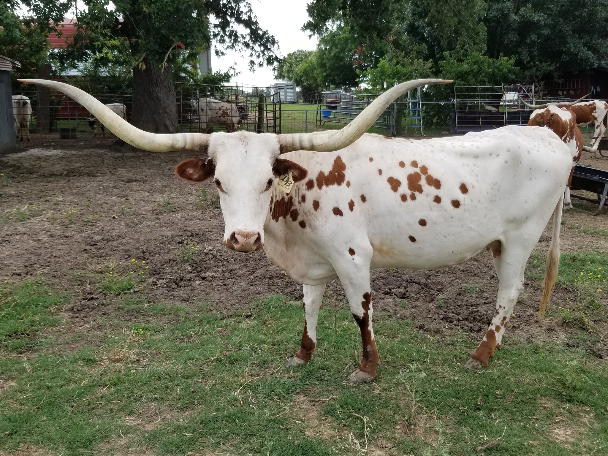 BL RIO TARI is an own daughter of JP RIO GRANDE. She is a white cow with, freckles and red spots and she has high handle bar horns, that are rolling over! TARI has been with our young bull, a son of HUBBLE'S 20 GAUGE.