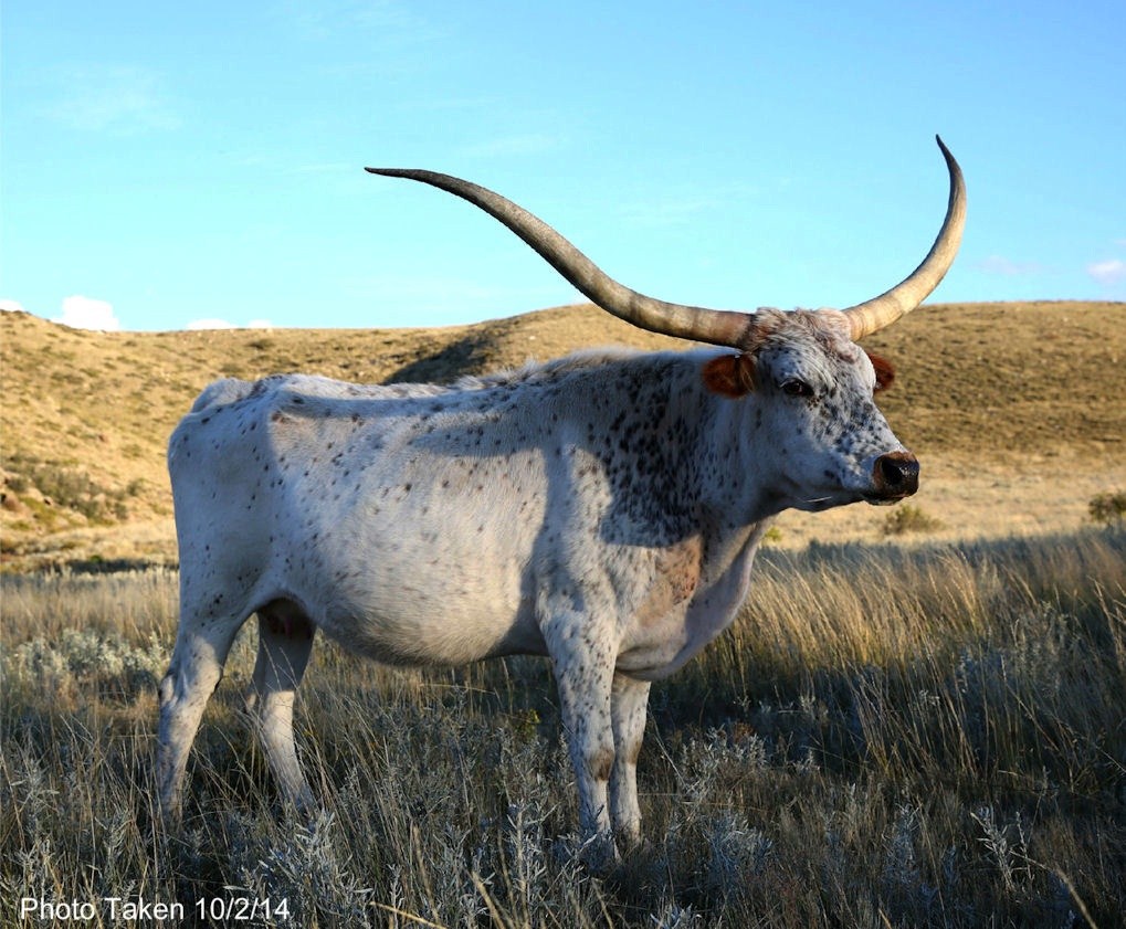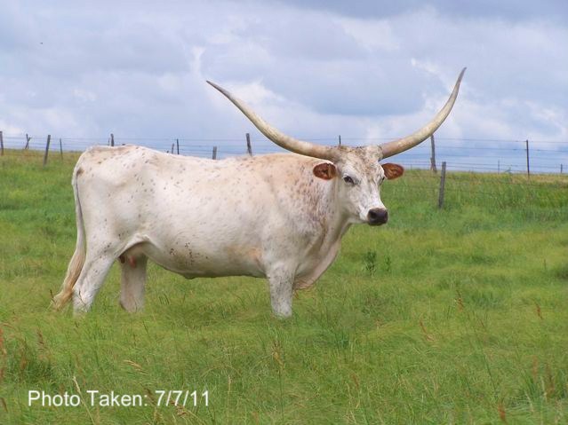 The ultimate foundation cow, with horns sweeping way back, she has a Rumble Rocket bull at side.