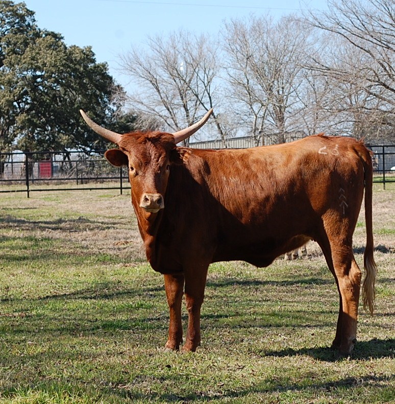 Solidly built red heifer whose dam measures well over 70". This heifer's horns look like they are going to roll back.