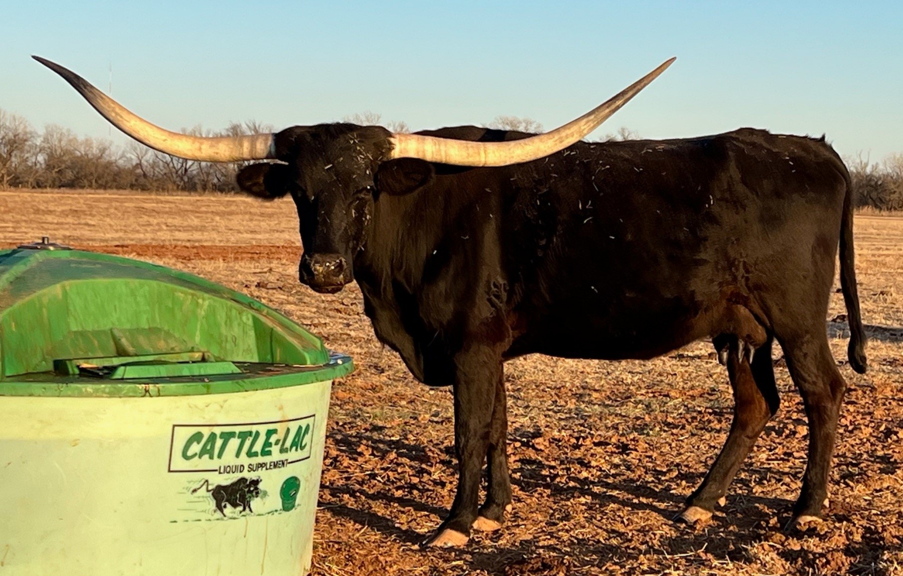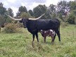 Nice , big horned cow. She has one teat that is large. I believe it was stepped on at some point. Does not cause any issues and the calf can eat off it.