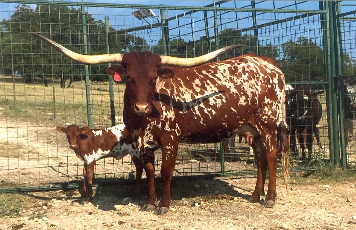 This beautiful young cow has color to burn and over 73" TTT of classic Texas twist. Her pedigree includes some of the best old-line longhorn greats like Tri-W Legends A-Do, Emperor, Senator and some Butler influence from Bob Loomis' VJ Tommie. She has given us two beautiful heifers out of two different bulls, that we are keeping. She sells with another gorgeous REBEL HR heifer (9/12/19) at side. Will be exposed to WARLOCK HR for a three-in-one package. Tested negative for Johnes, BVD, BLV.