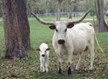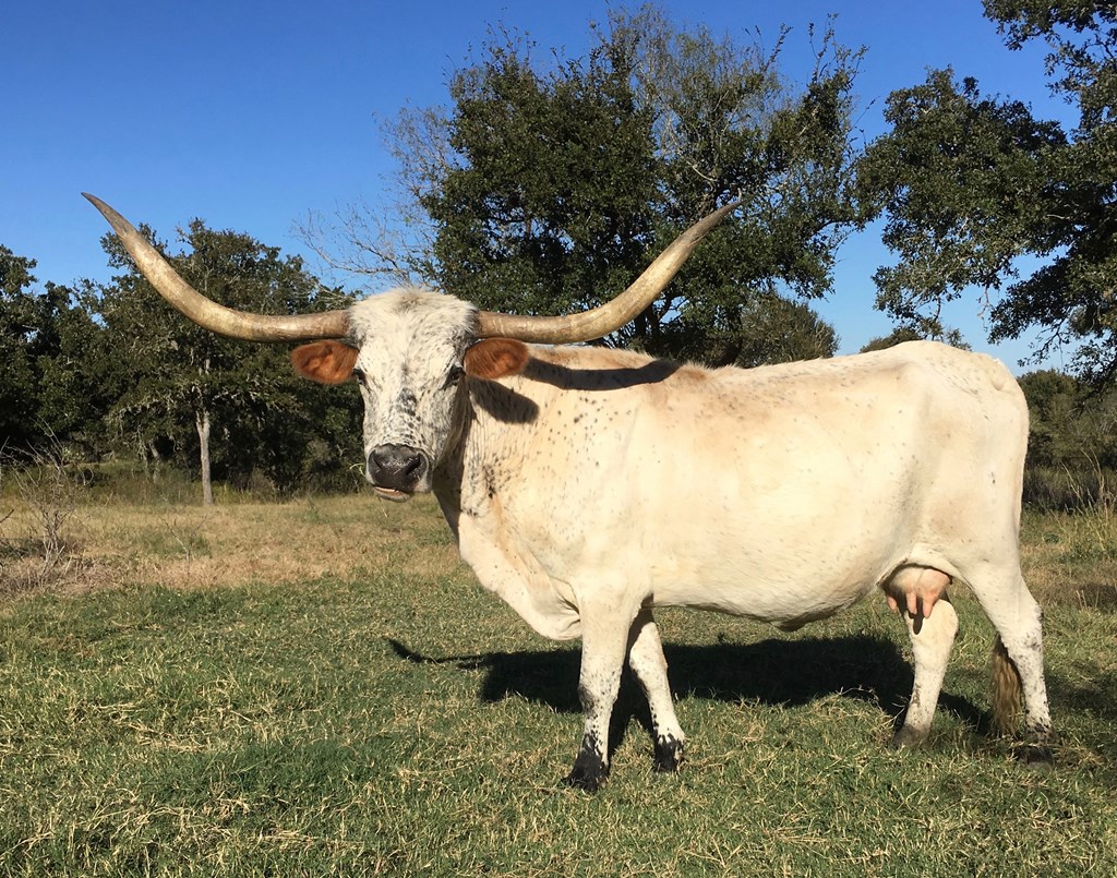DECEASED. Ms. Crystal Gayle is one of the first cows we raised and was official madam of this Texas juke joint. She’s a daughter of The Shadow and passed on her long, stout, correct conformation to her calves. She was a beautiful pale roan and had magnificent, heavy, sweeping horns that were just over 70” at her passing. Always raised a big correct calf with loads of horn, always black and white or roan. Excellent mother, eat out of your hand gentle and very easy on the eye. Hard to tell she was my favorite. Wish we had a whole herd like this one. Still have some of her incredible progeny for sale.