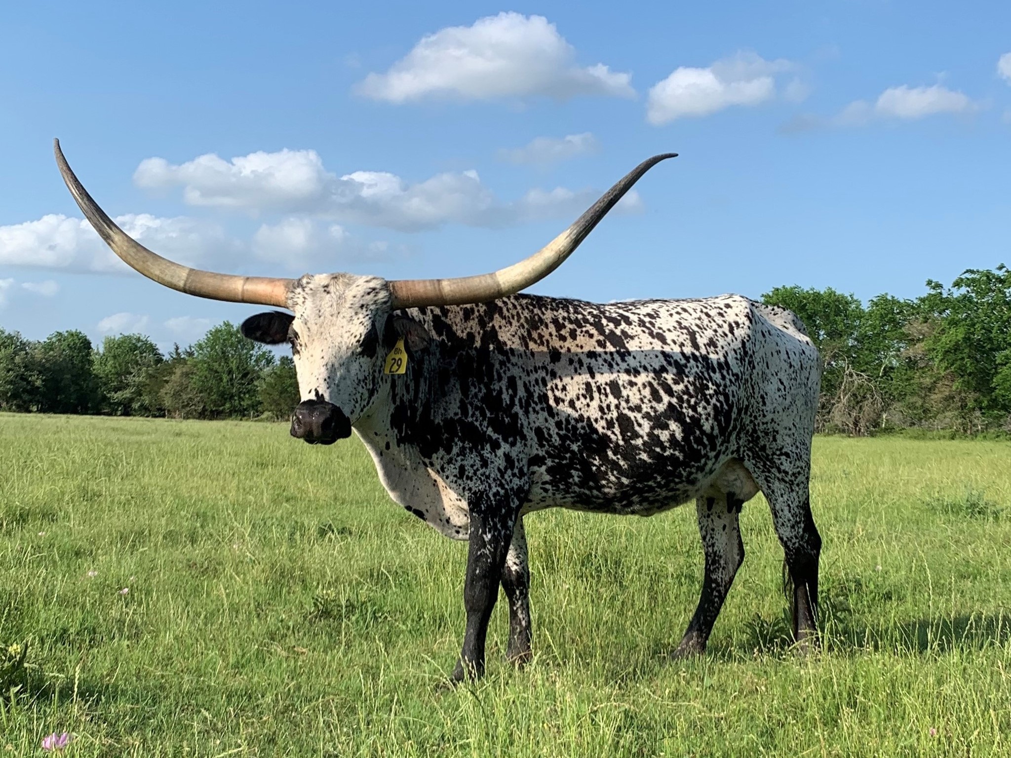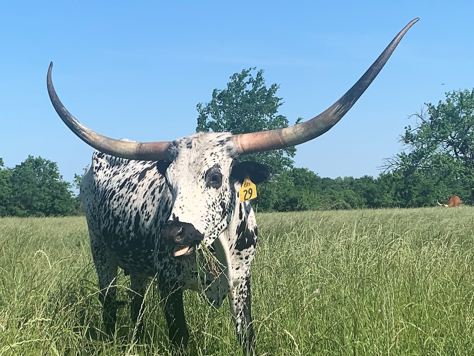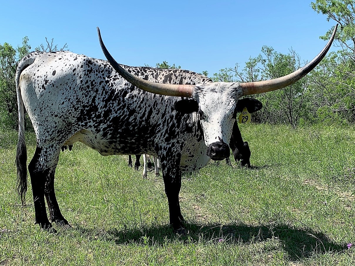 Most eye catching cow in the pasture. We sold her almost 90" twisty horned mother at the Legacy sale last year. Her tip to tip is just going to grow as she rolls those horns out. Her calf this year looks like the best horned heifer in early growth.