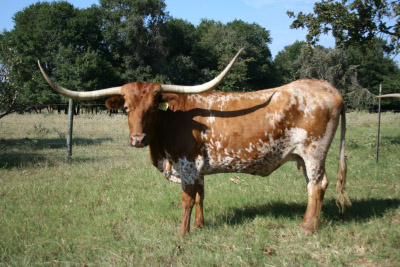 She still measures in the mid 60's after breaking 3" off of her right horn. She had twin heifers the last time around even though only 1 survived. Weaned her heifer. Exposed to M Arrow Dazzler.